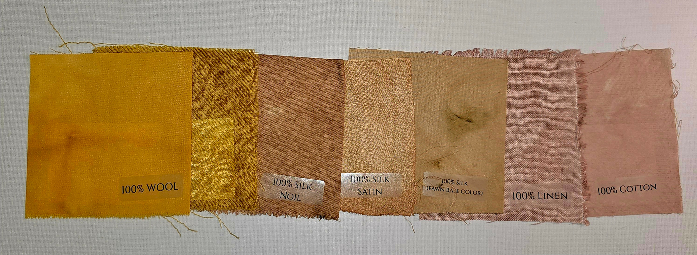 In this case, the cellulose fibers (cotton, linen) absorbed the beautiful pink tint, while the protein fibers (silk, wool) took on more of the tannic acids, resulting in a golden (silk) and brown (wool) color.